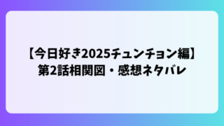 ティックトッカー・ユーチューバー 【今日好き2025チュンチョン編】第2話相関図・感想ネタバレ 2025年10月6日放送開始の「今日、好きになりました。2025チュンチョン編」。第2話でそれぞれの気になる相手がかたまりつつあります。今回は今日好き2025チュンチョン編の第2話について、私娘軍団ママの感想と考察、そして現段階での相関図を... 2025.10.14 ティックトッカー・ユーチューバーバラエティモデル俳優恋愛リアリティ